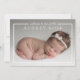 din glädje med det moderna nyfödda baby-födelsemeddelandet. På framsidan finns ett stort foto med "välkommen till vår värld" i skarp vit plus baby först och mitten namn i en modern vit text. Baksidan har tre fotosamlingar och alla viktiga detaljer som baby namn, födelsedatum, födelsestatus och förälderns namn i grått-typ. Anpassad enkelt med egna foton och egen text.