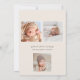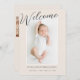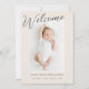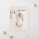 Modern välkomstmeddelande om foto i baby. Flerfoto-födelseattest med ställe för ett baby-foto på framsidan och tre mindre foton på baksidan. Minimal modern design med skript som läser Välkommen på framsidan av födelsemeddelandet.