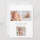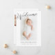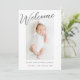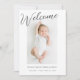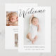Modern välkomstmeddelande om foto i Baby. Flerfoto-födelseattest med ställe för ett baby-foto på framsidan och tre mindre foton på baksidan. Minimal modern design med skript Välkommen på framsidan av födelsemeddelandet.