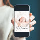 Ett modernt kort för att tillkännage din baby födelse, med ett foto med "Välkommen" skrivet överst i ett snyggt-skript. Under jorden tillsätts hans eller hennes namn, födelsedatum och födelsestatus. På baksidan lägger du till ytterligare tre meddelanden om bilder och personlig.