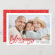 Snyggtens helgdag-fotokort som innehåller ord "Blessings" i ett trendig-skript, en bild- och textplatshållare och en röd och vit modern punktdesign på baksidan av inbjudan.