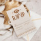 Ett modernt västerländskt bröllops-svarskort med varma neutrala toner och djärva sydvästinspirerade mönster. Perfekt för ranch-, öken- eller utomhusbröllop med en semi-formell västerländsk känsla. Finns tillgängligt som professionellt tryckta inbjudningar eller som en praktisk digital fil för enkel delning.