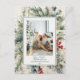 Det här moderna vattenfärgsfoto-vykortet för botaniskt julfoto har en enastående utformning av elegantens grönare, med lush grönt och blåaktiga nyanser, som accentueras av guld färg och röda bär. Vattenfärgstekniken ge är ett vackert, naturligt utseende och skapar en fredlig atmosfär. "God jul" är elegant skrivet i dekorativ kalligrafi och skapar en vacker kontrast som fångar helgdag. Anpassa kortet med ditt foto, din familj namn och ditt år, och skapa en riktig keepy för dina kära.