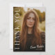 Detta moderna eleganta stilrena examensbevis tackkort med foto har en vertikal bild och rubrik med anpassningsbart skriptnamn och text på framsidan. Baksidan har ett personligt tackmeddelande och horisontell bild. Ett bra sätt att visa upp din examen. Klicka på redigeringsknappen för att anpassa denna design.