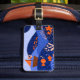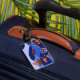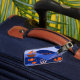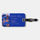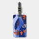 This luggage tag features a vibrant, stylized landscape with a whimsical and modern aesthetic. It uses a rich color palette of deep blues and orange an to create a layered, multi-dimensional scene with imaginative details, including flying fish, birds, a small sailboat, and coral reefs. The design is characterized by clean lines and high-contrast colors that give it a playful yet sophisticated feel.