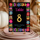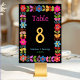 Ge ert mottagande bord modig elegans med det moderna mexikanska Bordsnumret Bröllop. Framställd av en sjudande uppsättning färgstarka blommigtar inspirerade av traditionell mexikansk folkkonst, har den slående designen rik av rött, gult, rosa och turkos som ställs in mot en djup svart bakgrund. Genom att fånga kontrast i öga ser man till att bordsnumret blir tydligt, medan den festliga blommigten ram tillför värme, kultur och firande till er décor. Perfekt för par som vill blanda ihop det moderna stil med glatta, arvsinspirerade detaljer.