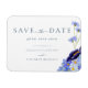 Spara datumet med elegant stil med unik, handmålad vildblomsakvarellkonst och vacker typografiskristall som är lätt att anpassa med brudens och brudgummens namn och bröllopsdatum. Modern vildblomma-vattenfärg "save the date"-karta för ett boho-blommigt sommarbröllop. Unika ängsblommor inklusive blåklint, vallmo, kosmos och förgätmigej med ömtålig lövverk målad av konstnären Catherine Sweetman i blåklintsblå, rosablå, marinblå, lila och gröna nyanser. Perfekt för den botaniska trädgården eller utomhus våren eller sommaren trädgårdsängen bröllop. Hitta matchande föremål i den moderna vildblomma-blå brölloppsserien