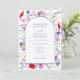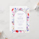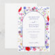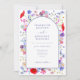 Vacker akvarell blomstermönster elegant lila välvd bröllopsinbjudan med färgglada vilda blommor och idealisk för vår- eller sommarbröllop. En fantasifull men ändå stilren design med modern typsnittsstil med lättanpassade mallar i lila. Vildblommålningar inkluderar livfulla röda vallmo, blåklint, kosmosblommor, forget me nots och knappar i lila, rosa, persika, salvia grön, turkos, orange och blå. Originell botanisk konst av konstnären Catherine Sweetman