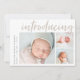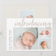 En elegant och ett modernt födelseattest med tre foton (ett kvadratiskt och två vågräna), med "introduktion" i översta delen av den handskrivna penselskripttypografin. Anpassa till din baby namn och födelsestatus längs den lämnat sidan. Lägg till ett personligt meddelande på baksidan, tillsammans med ett ytterligare foto.