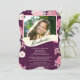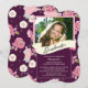 Fira det spännande avgångsåret 2014 med denna unika examensfoto Examensfest inbjudan eller vacker foto examensmeddelande med vackra rosa blommor på plommonlila bakgrund med ett modernt examensavgångsdiplom. Vänd på vår eleganta vintage blomsterinbjudan för att hitta en matchande blomsterbakgrund för en extra speciell touch. Vår feminina helt anpassningsbara kort ger dig möjlighet att visa upp din egen personliga stil. Perfekt examensfest inbjudan för en gymnasieexamen eller högskoleexamen.
