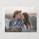 Enkla och moderna spara datum meddelande-kort med fullt-utfallsbilder på framsidan. "Spara datumet" visas i en övertäckning av den moderna vintagen. Anpassa framsidan av det moderna fotot spara datumkortet genom att lägga till namn, bröllop datum och bröllop. En övertoning för mörk (tillval) visas för att göra texten tydlig. Datumkortets minimalistskydd återgår till visningen med ett tunt, vitt diagonalt rand-format med bakgrund eller färg efter eget val.