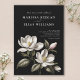 Säg "ja" med charm från Södern! Denna iögonfallande inbjudan slår an med en vintage-inspirerad illustration av krämiga vita magnolior mot en dramatisk svart bakgrund. Enkla, eleganta serif-typsnitt i krispigt vitt fullbordar utseendet och låter din kärlekshistoria ta huvudrollen. Vänd på den och lägg till ditt eget älskade foto för en personlig touch som dina gäster kommer att älska. Perfekt för magnolia-älskare, sydstatliga bröllop, trädgårdsfester och alla som längtar efter en touch av tidlös elegans.