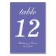 En enkel bordskort för ett violett bröllop. Det är bara vit text på en lila bakgrund. Allt utom själva numret är skrivet med en elegant kalligrafisk skrift.