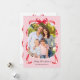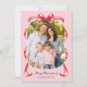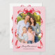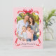 Det här visuella jokerkortet visar en böjd bild, elegant försedd med en charmerande röd båge och band på ljus rosa bakgrund. Med baksidan får du plats för ett andra foto och en andra anpassningsbar, så att du kan lägga till ditt eget personliga meddelande.