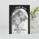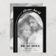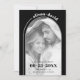 Det här Spara datumkortet har en modern och minimalistisk utformning som använder svart och vitt färg. Det visar en modern båge som ramlar in ett foto av paret och lägger till en elegant. Parets namn skrivs i ett böjt snyggt överst, efter kurvan för en linje som sträcker sig till högerna. Färg runt bågen är svart. Kortets baksida innehåller ett annat foto och parets bröllop webbplats.