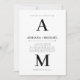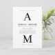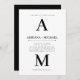 En djärv, modern bröllopsinbjudan med svart typografi på vit bakgrund. Med ett stort initialer av bruden och brudgummen överst och grund har detta stor visuell inverkan. Enkel att anpassa med användarvänliga mallar. Detta är idealiskt för en contemporary bröllop och användor endast för parets första namn. Baksidan är en solid svart bakgrund.