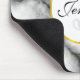 En muspekare med en klassad, modern marmorerad mönster. Vitt, svart och rökfritt grått marmor med tunt rosett band faux-guld-snurrar över hela mönster. En vit cirkel med faux-guld ram överst med ditt monogram initialt och namn inuti.