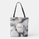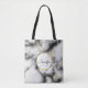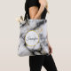 En toteväska med en klassad, modern marmorerad mönster. Vitt, svart och rökfritt grått marmor med tunt rosett band faux-guld-snurrar över hela mönster. En vit cirkel med faux-guld ram överst med ditt monogram initialt och namn inuti.