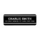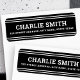 Svarta eller anpassningsbar färg-returetiketter med vit linjer överst och grund och ditt namn i ett vitt, fetstilt teckensnitt med returadressen nedan. Typsnitt och färg kan anpassas med verktyg.
