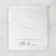 Snyggt och modernt vikt bröllop-platskort med ett trendig svart skriptteckensnitt, vit marmorbakgrund och utrymme för gästens namn och bordsnummer. På baksidan av elegant bröllop kan du byta till ett färg efter eget val med hjälp av Anpassad verktyg.