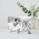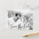 Snyggt moderna vykort i bröllop spara datum med ett skript i svart trendig, platshållare för anpassningsbarnas text och förlovning och vit marmorbakgrund. Baksidan av vykortet innehåller alternativet för anpassningsbar eller kan lämnas tomt för ett handskrivet meddelande.