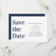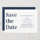 Dessa kort för att spara datumet har en modern och elegant marinblå och vit design. "Spara datumet" är tryckt i ett stort typsnitt på vänster sida. Bröllops- eller evenemangsinformationen är tryckt på höger sida.