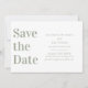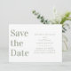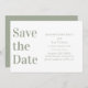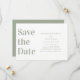 Dessa kort för att spara datumet har en modern och elegant salvia grön och vit design. "Spara datumet" är tryckt i en stor typsnitt på vänster sida. Bröllops- eller evenemangsinformationen är tryckt på höger sida.