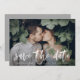 Modern "save the date"-kort med "Spara datum" som visas i ett vitt, akvarellskript som överlagras på ditt horisontella engagemangsfoto. Anpassa framsidan av fotots "save the date" med era namn, bröllopsdatum, bröllopsplats osv. Baksidan av kortet har en enfärgad grå bakgrund eller den färg du väljer. Lägg till ytterligare text och bilder för en unik design! Tillgänglig för direkt nedladdning, tryckta kort eller båda.