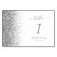 Den vänstra kanten på detta eleganta moderna bröllopsbordnummer har en silverfärgad falsk glitterdesign. Den anpassningsbara texten kombinerar grå handskrift, kopparstick och kursiva teckensnitt på en vit bakgrund.