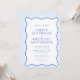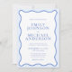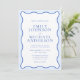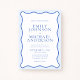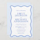 A modern wedding invitation featuring a crisp white center framed with a bold wavy border in vibrant blue, set against a soft blue background. The flowing wavy frame adds a contemporary yet elegant feel, while the clean white center keeps the layout timeless and easy to read.