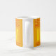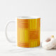 Mugg har ett modernt mönster i mitten av århundradet som ser ut som en väv med rött och gult linjer på fält i guld.
