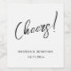 Elegant personligt bröllp flaska har en typografisk design av svartfärgade kalligrafiskript med namn och bröllop-datum för att anpassa sig till en enkel vit bakgrund med ord "Cheers!:.. Bästa önskemål för bröllop och giftermål! Designad av Susan Coffey.