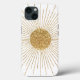 Elegant som lyfter faux guld solsprängning Minimalistisk soldesign, med en mystisk guld färg och strålande magisk symbol, bestående av en cirkel och linjer geometriska former, på en helt vit bakgrund. Denna sol-grafik i andlig ger positiva effekter och lycklig energi.