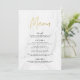 Snyggt och aktuellt menykort för bröllop med ett faux guld-trendig-skript, vit marble-bakgrund och platshållare för personligt bröllp-menyn. Baksidan av menyn Marble och guld bröllop kan ändras till ett färg efter eget val med verktyg Customize.