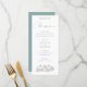 Modern White Pumpkins Blommigtar Bröllop. Tre pumpor med vita blommigtar och tealblad finns vid grund med en korinerande teal på baksidan, med ett skript för Menu med elegant och som är lätt att anpassa resten av texten till dina behov.