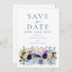Blomfärgade vattenfärgade vilda blommor och blad bröllop spara datum inbjudan i marinblått, dammigt blått, kornrosblått, marinblått, lila, rosa, gult, burg, magenta och grönt. Anpassa bruden och odlar monogram initialer på inbjudningens baksida. Perfekt för ett unikt bröllop spara datum för vår eller sommar bröllop. Elegantens moderna typografi i marinblått kompletterar den vimska bohos vackra teckningar som omfattar kornblommor, vallmo, kosmos, glöm mig inte, daisy, billeknapp och ömtålig löv. Chic bohemian bröllop spara datum bjuder perfekt till en vår-skugga, sommarträdgårdsbröllop. Originalkonstverk av konstnären Catherine Sweetman