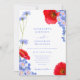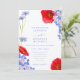 Vackra eleganter målade vattenfärgade botaniska sommarblommor i dammig kornblomblått, lila, rosa, rött, grönt och gult bröllopsinbjudan. Blommor inklusive kornblommor, daisy, poppies och glöm mig inte. Enkel att använda mall med moderna typografiskript för elegant. Perfekt för en unik blomma, botanisk marinblått temat sommar eller vår bröllop. Unik originalteckning av konstnären Catherine Sweetman