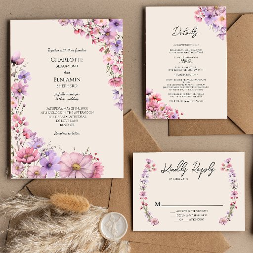 Den här moderna inbjudan till fotobröllop med vilda blommor har en varm beige bakgrund med skarp rosa och lila vildblommor, vilket framkallar en känsla av tidlös romantik. Giftermål i rustik och elegant boho charm gör denna perfekt till par som söker ett modernt vildblomsterestetiskt. Oavsett om du har en vit trädgård firande eller en chic inomhus bröllop, ger den här designen upphov till olika smaker och ser till att bröllop är lika livskraftigt och speciellt som kärlek. Om du vill ha samordning av personligen eller frågor, tveka inte att nå ut.