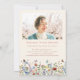 Detta är ett modernt och fantasifullt begravningskort för att fira minnet av din älskade. Designen har en vacker kalligrafisk font och vackra vilda blommor i pastellfärger rosa, lila, blå, gula och roströda eller terrakotta samt ömtåliga fladdrande fjärilar. Denna livsinvitation kan enkelt anpassas med ditt eget foto och text för att skapa en speciell hyllning till din älskades begravning, minnesstund eller firande av livet med hjälp av den medföljande mallen.