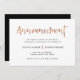 Detta fräscha och moderna kort låter alla veta på ett smakfullt och stilrent sätt att ert kommande bröllop har blivit inställt, uppskjutet eller helt enkelt blivit ombokad. Trendig handskriven stil säger "annons" längst upp i falskt roseguld, för en chic, svart-vit look med en klassisk svart baksida.