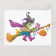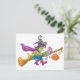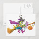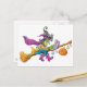 Cute Halloween-design med en häxa i lila och turkos som rider en bom. Bromsen är dekorerad med stjärnor och en pumpa och häxan konsulterar hennes bärbara dator