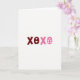 This card shows the simple message “XOXO” stretched across a white background. The four letters sit in a straight row, guiding your eyes from left to right. The first X and O are a deep maroon, giving the start a classic romantic feel. The second X and O switch to a bright fuchsia, adding a fun pop of color without feeling busy. Both O’s are shaped a bit like smooth eggs, and each one has small white heart cutouts inside—two hearts in the maroon O and five hearts in the fuchsia O. The “XOXO” text looks like thick, modern lettering, centered on the front so it’s the first thing you notice. It feels meaningful because it says “hugs and kisses” in a simple way, and the hearts make the affection easy to see 🥰❤️.