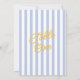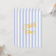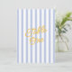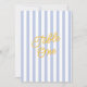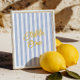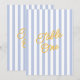 A fresh and modern wedding table number card featuring classic blue and white stripes paired with a soft lemon yellow script. The bold striped background creates a clean, structured look while the handwritten typography adds a warm, relaxed touch.