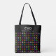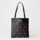 Modern anpassad text och initialer toteväska. Färgglatt änglamönster på svart bakgrund.