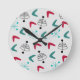 Denna väggklocka har en modern kärndesign i mitten av århundradet av bumerangformer, antenner och stjärnsprängningar i teal, magenta, blått och svart.