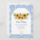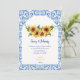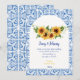 Planerar du ett italienskt medelhavsinspirerat bröllop eller använder solrosor i din brudbukett eller i dina dekorationer för mittpunkten? Då kommer du att älska denna klassiska unik kombination av blå och vita moderna plattor med eukalyptus solros bröllopsinbjudan design! Anpassa med dina detaljer