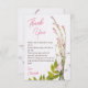 Uttryck din hjärtliga tacksamhet med vårt Boho Wildflower Foto Bridal Shower Tacksamt Kort. Detta eleganta kort har ett originalfoto på ömtåliga vilda blommor och frodiga gröna blad, mot en mjuk vit bakgrund. Texten "Tack" är vackert skriven i ett stilrent rosa script-teckensnitt, vilket ger en touch av värme och sofistikation. Kombinationen av naturliga vilda blommor och elegant typografi skapar en lugn och charmerande design, vilket gör detta kort till ett perfekt sätt att uttrycka din tacksamhet efter en minnesvärd brudshower.