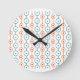 Den här klockan har ett modernt mönster i mitten av århundradet med cirklar som är uppspända i retro-skuggor av teal och orange på en vit fält.