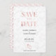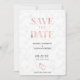 Elegant och modern Save the Date-annonsering med texten "Spara datum" och en bröllopsringgrafisk i falskt rosenbladsguld på en ljusgrå och vit marmorerad bakgrund. Lägg till dina detaljer i ett klassiskt serif-teckensnitt. Baksidan av korten har ett mönster av samma bröllopsringar på en svart bakgrund.