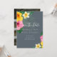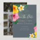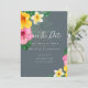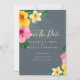 bröllopbudgetspara datumleahgtropiskt bröllopspara datumlapparstrandbrölloptropiska blommorrosa gula blommordestinationsbröllop